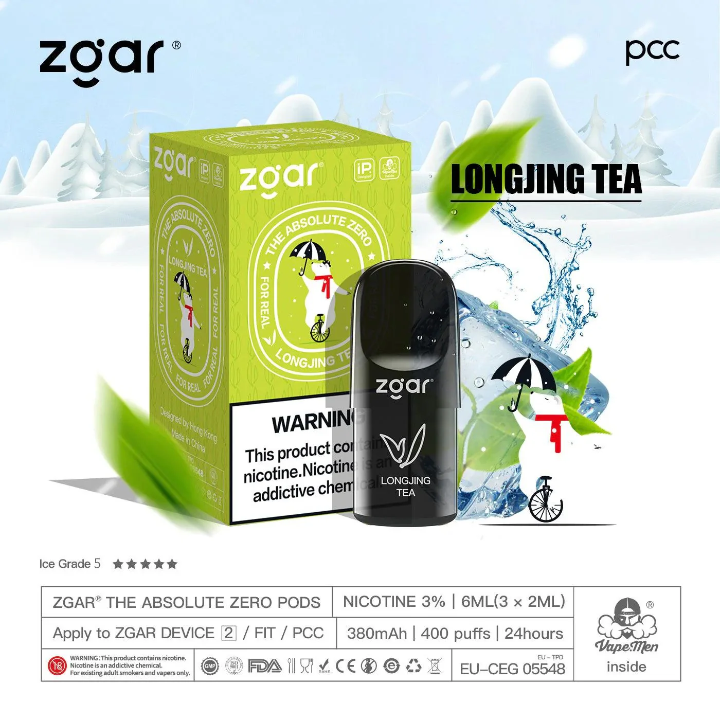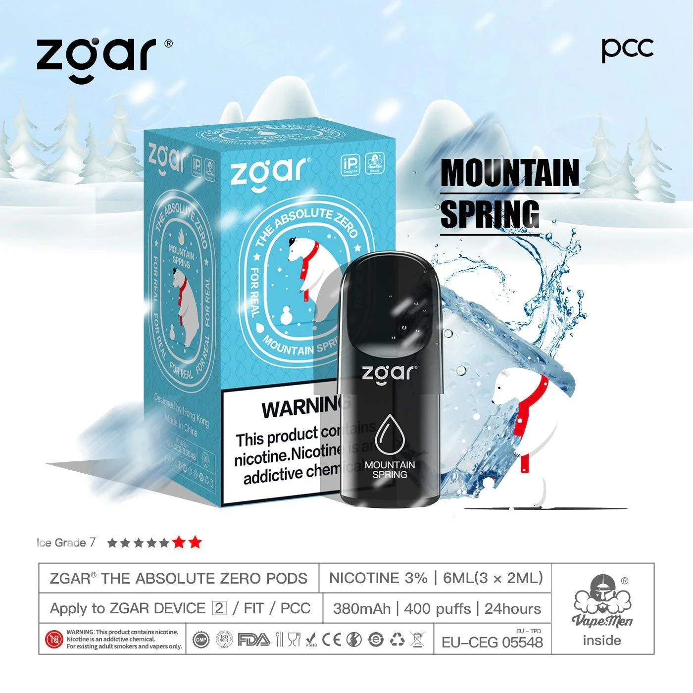 美版冰熊ZGAR Pod 4/5代冰水(Spring Mountain Water)三颗装烟弹-悦刻RELX海外四五六代/国标烟杆可通用