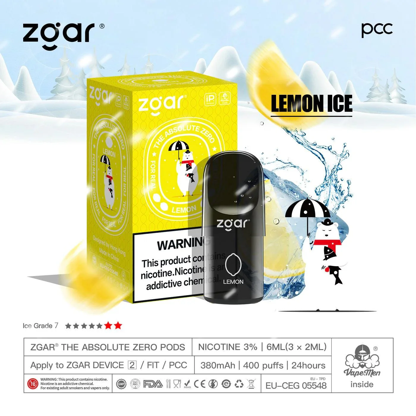 美版冰熊ZGAR Pod 4/5代柠檬(Lemon)三颗装烟弹-悦刻RELX海外四五六代/国标烟杆可通用