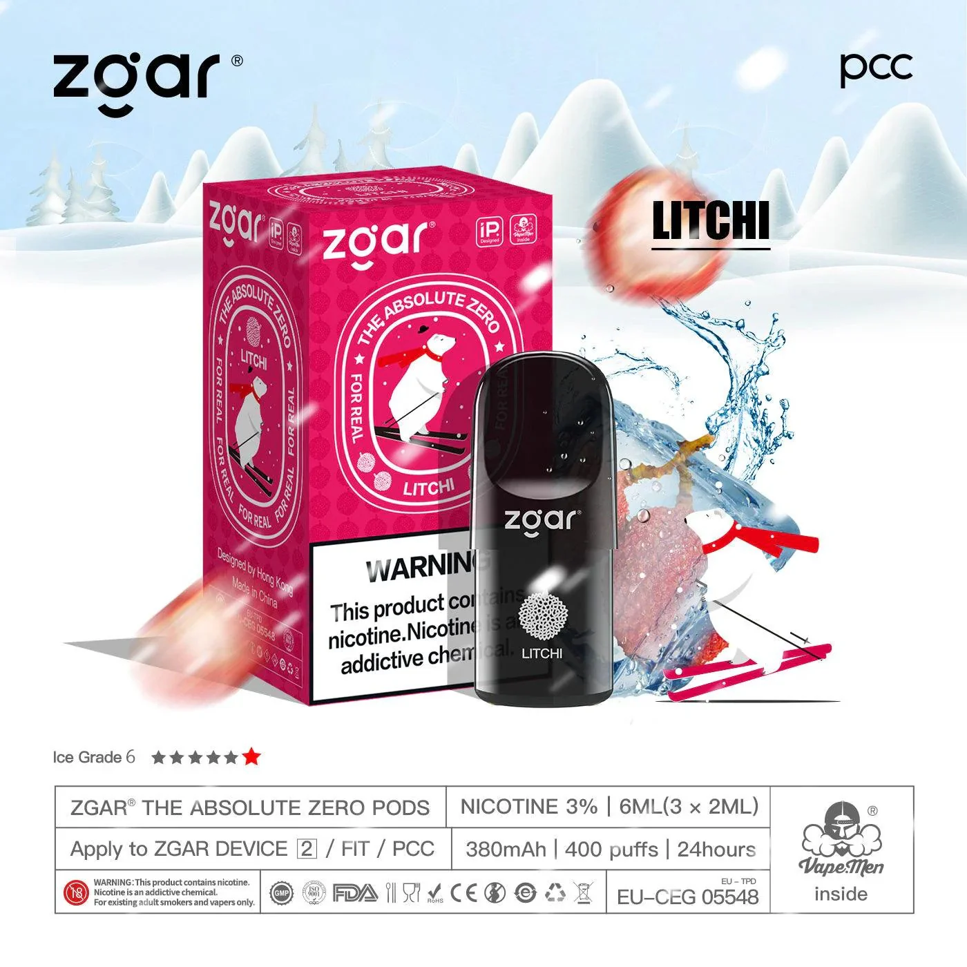 美版冰熊ZGAR Pod 4/5代荔枝(Iced Lychee)三颗装烟弹-悦刻RELX海外四五六代/国标烟杆可通用